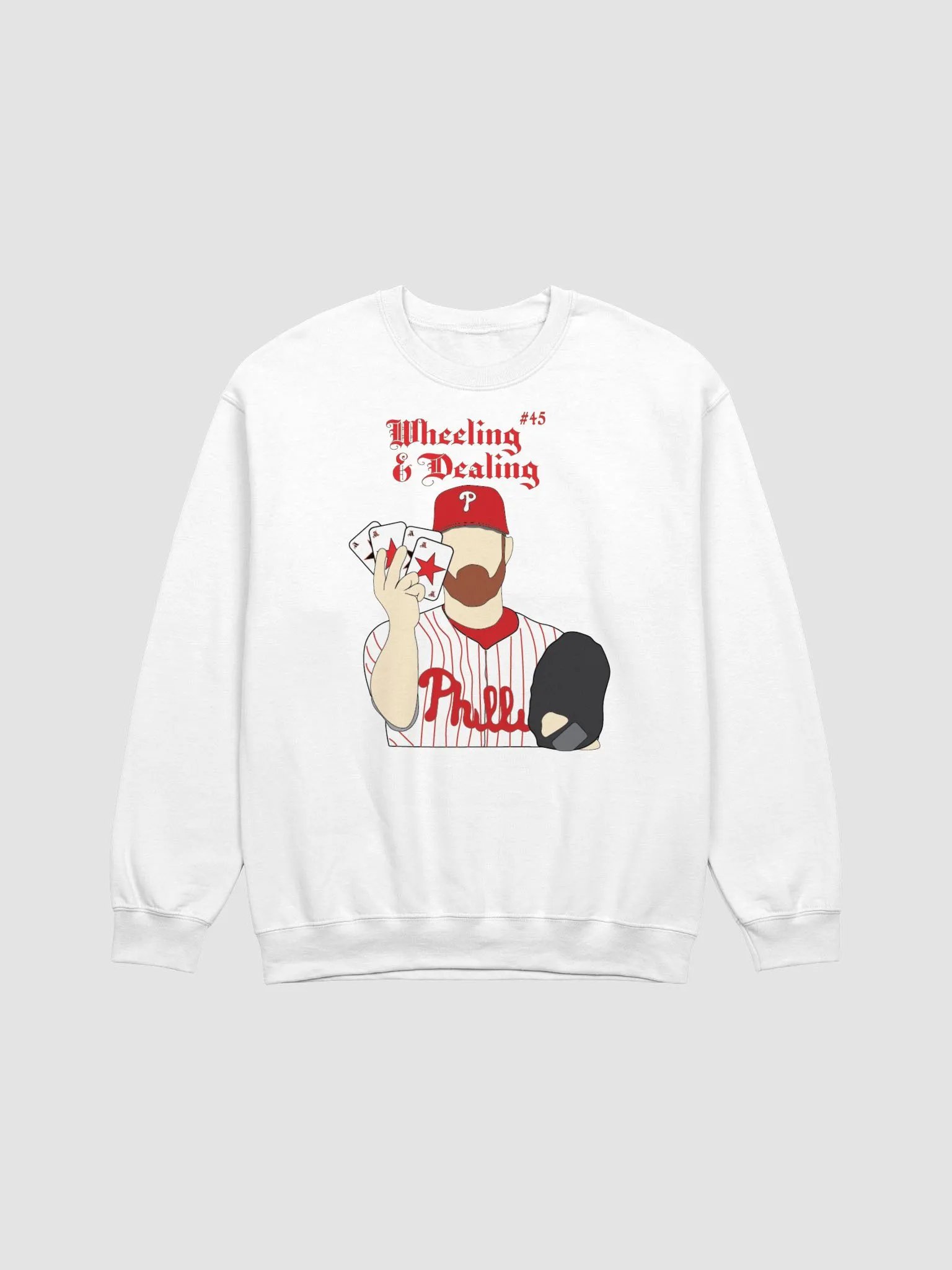 Product Description: Stay warm while repping one of the most electric pitchers in the league with our "Wheeling & Dealing" Crewneck Sweatshirt. Whether you're heading to Citizens Bank Park or watching from home, this cozy crewneck is the perfect way to support Zach Wheeler as he dominates the mound with his fastball and breaking pitches.